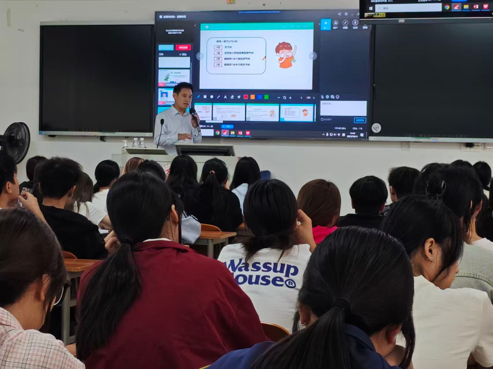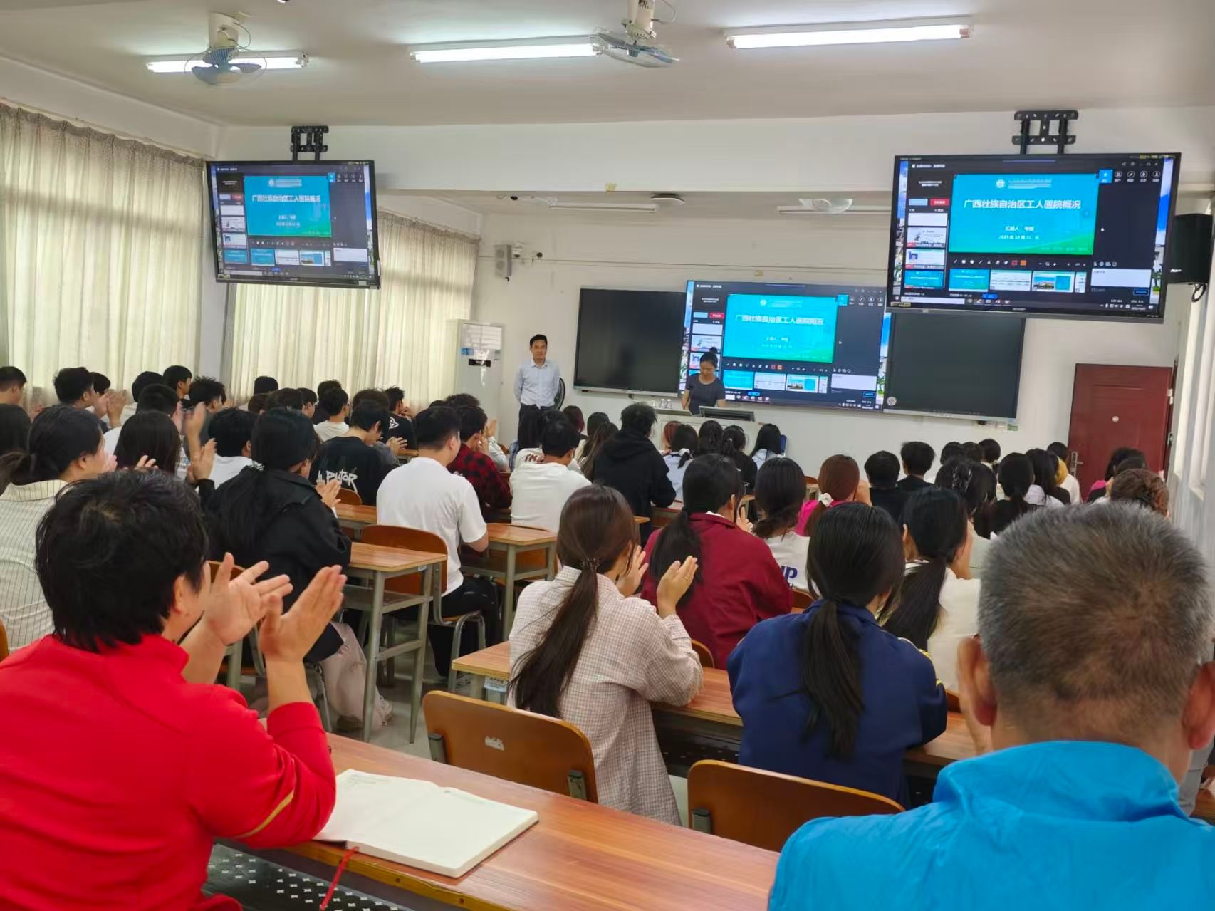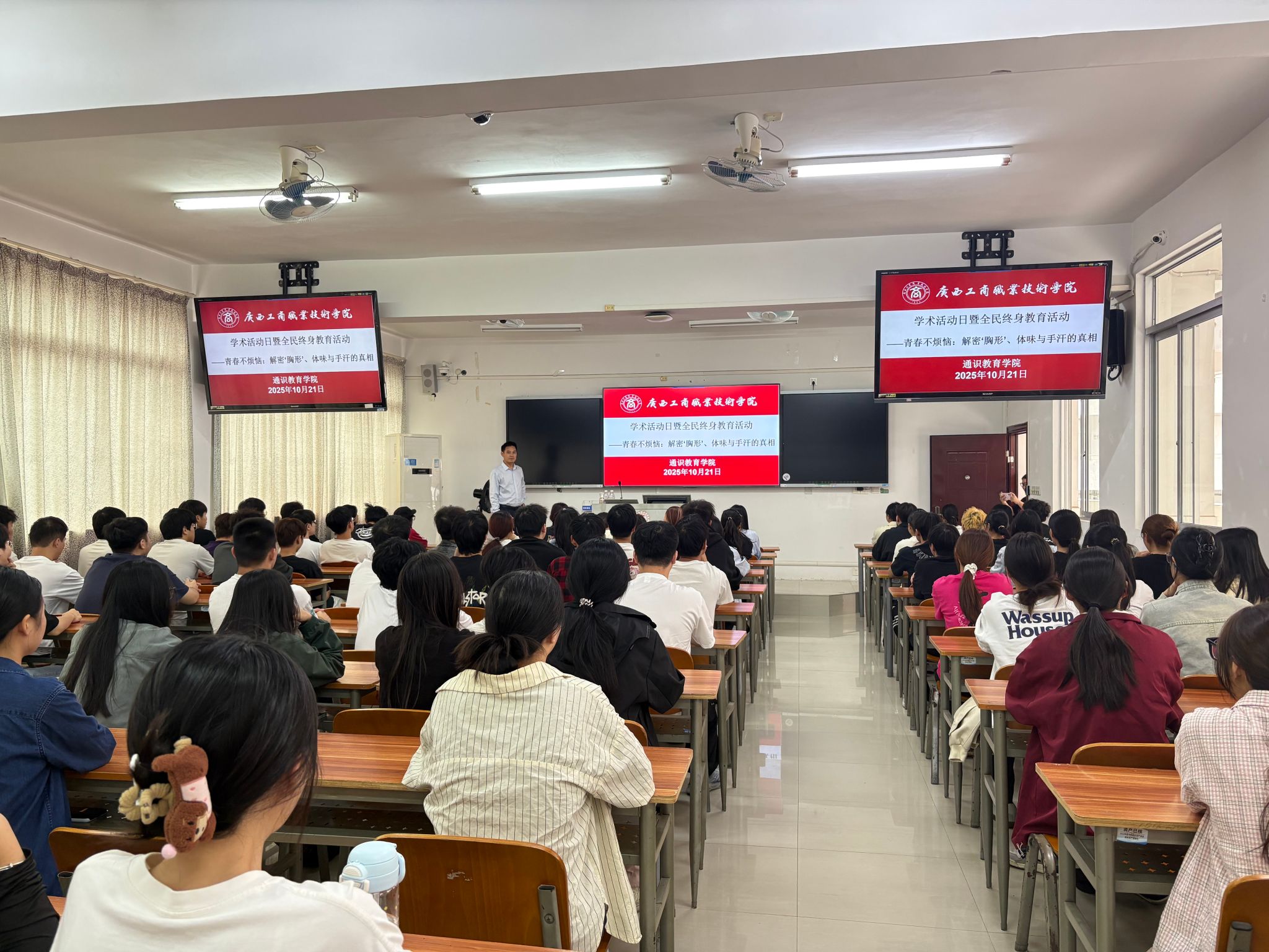 为帮助师生破解青春期常见健康困惑,树立科学认知,10月28日下午,通识教育学院体育教研室特邀广西壮族自治区工人医院胸外科、腺体外科主任韦植副主任医师,在教学楼开展“青春不烦恼:解密‘胸形’、体味与手汗的真相”主题学术讲座。韦主任深耕胸外科与腺体外科领域多年,担任广西医师协会心胸外科分会委员、应急医疗专家组成员等多项职务,且有解放军303医院工作经历及陆军医大学、中山大学肿瘤防治研究所研修背景,在青少年相关健康问题诊疗上经验颇丰,讲座吸引众多师生到场聆听。